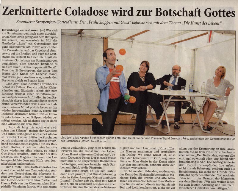 Ich vermute, nein - eigentlich bin ich mir sicher, sie wäre nicht zu mir gekommen, wenn diese Nummer nach 10 min. am Beginn des Abends dran gewesen wäre, sondern dann zu ihrer Mutter. Aber nach 40 min. war anscheinend so viel Vertrauen da, dass sie mit ihrer Angst direkt zu mir kam. Diese Situation war für viele Anwesenden beeindruckend. Für den Veranstalter war das der Höhepunkt des gelungenen Auftritts: '..., dass die Menschen begeistert waren, dass die frohe Botschaft so natürlich und ehrlich ankam und eben besonders, dass dieses kleine Mädchen so viel Vertrauen gewonnen hat und mit ihrem Anliegen sofort zu Dir gekommen ist.'